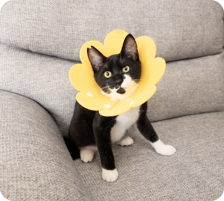 術後は、エリザベスカラー(首の周りに巻くプラスチックの保護材)とエリザベスウェア(体幹を覆う洋服)を着用し、創部を舐めないようにしていただく必要があります。どちらも当院でご用意可能ですが、ご自身でご用意していただいても大丈夫です。